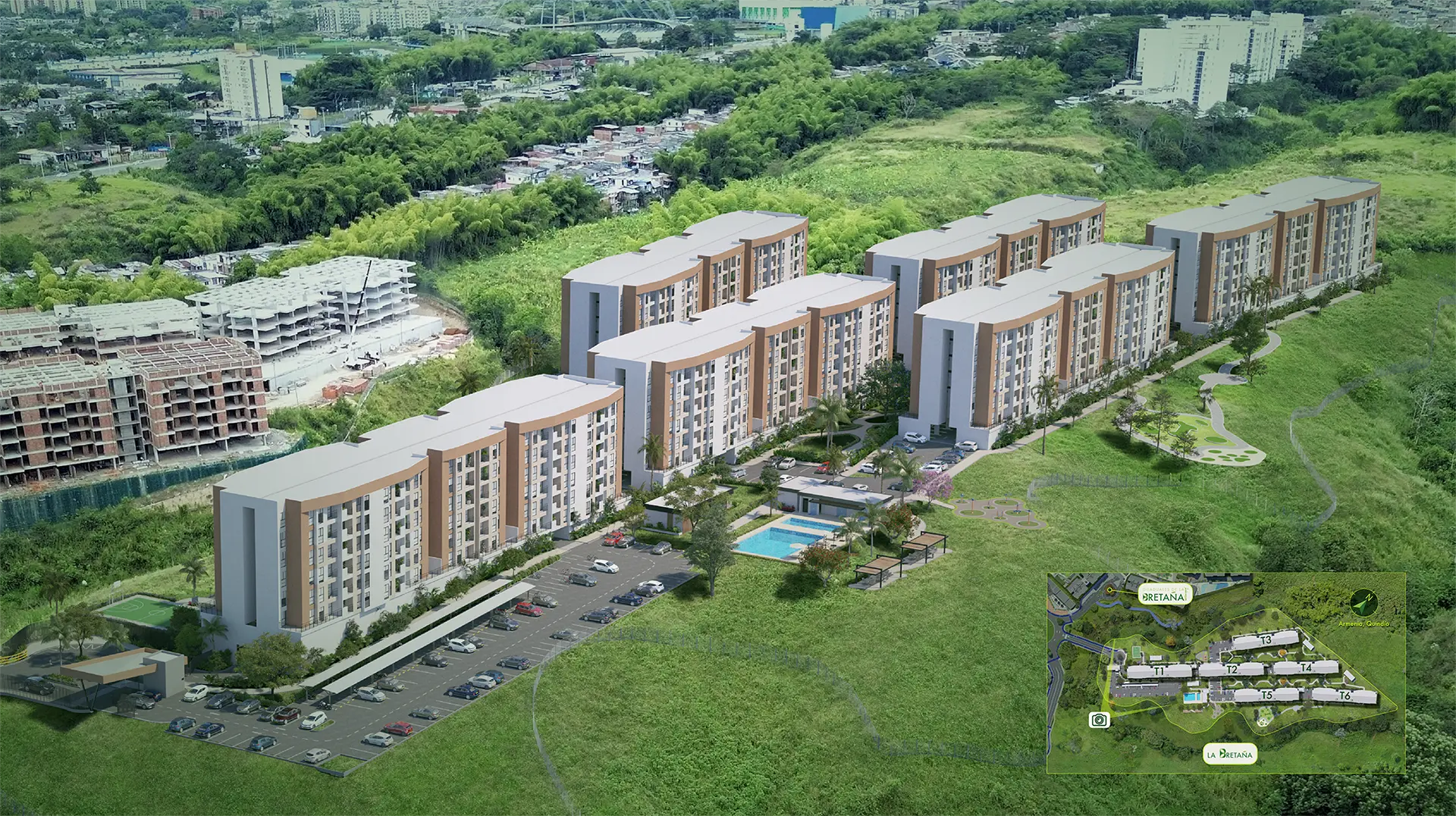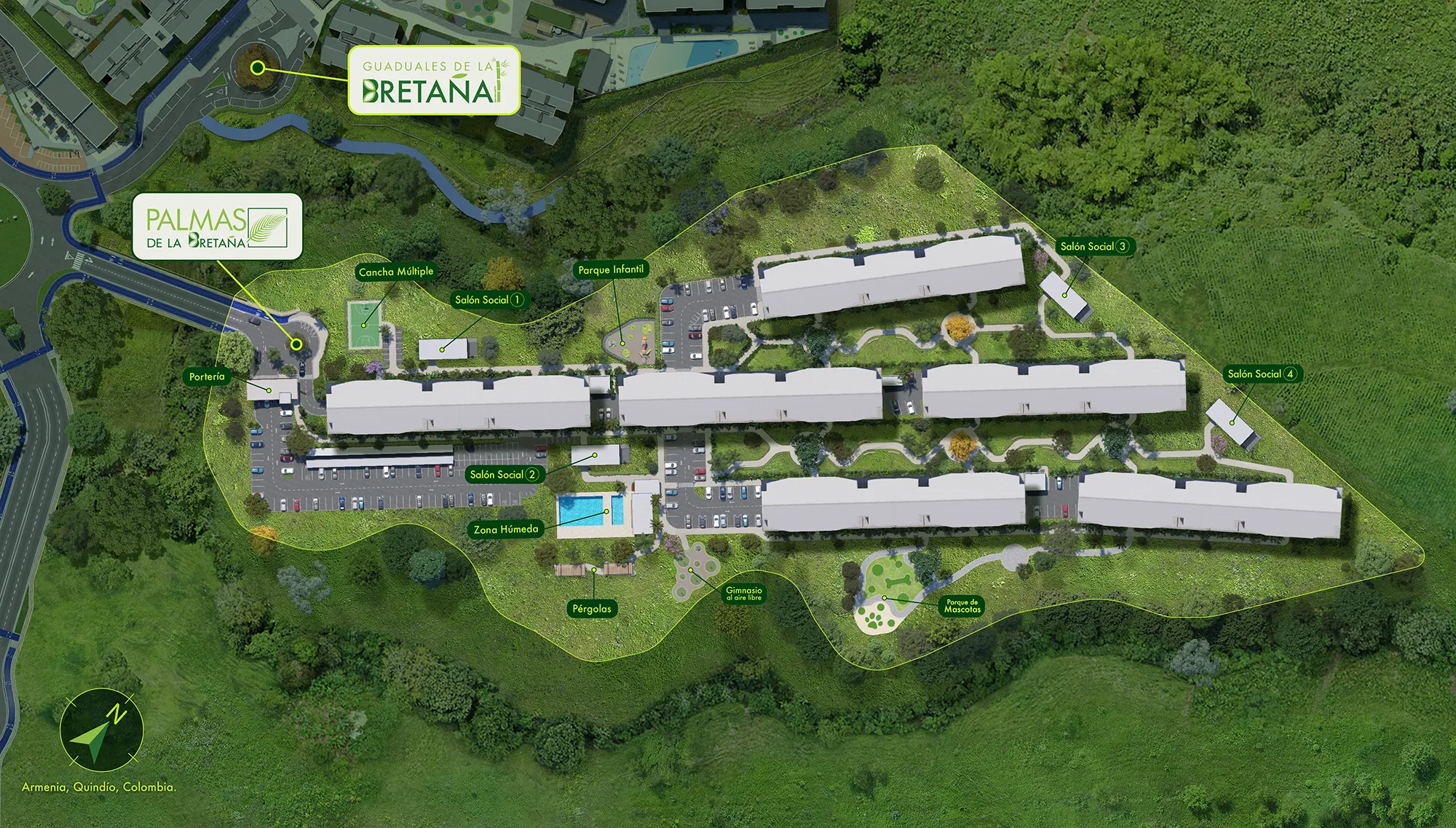 El concepto de ciudad propuesto será viable únicamente si todo el proyecto diseñado se llegaré a construir de lo contrario la sociedad desarrolladora se reserva el derecho de realizar las modificaciones que considere pertinente. Es de aclarar que el lote está compuesto por un área total aproximada de 66 Hectáreas, de las cuales 46 corresponden a suelo urbano y 20 a suelo de expansión de futuro desarrollo, estas deberán ser incorporadas mediante cualquier herramienta jurídica disponible en el tiempo. La imagen es únicamente una representación artística aproximada del diseño, alturas, áreas de lotes o uso son susceptibles a cambios por parte de la sociedad desarrolladora sin previo aviso.